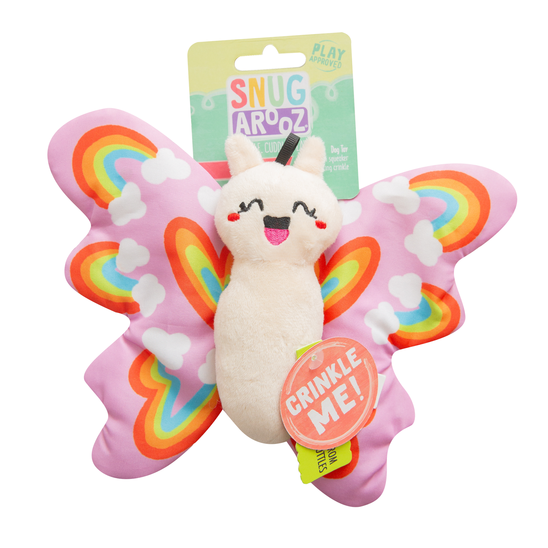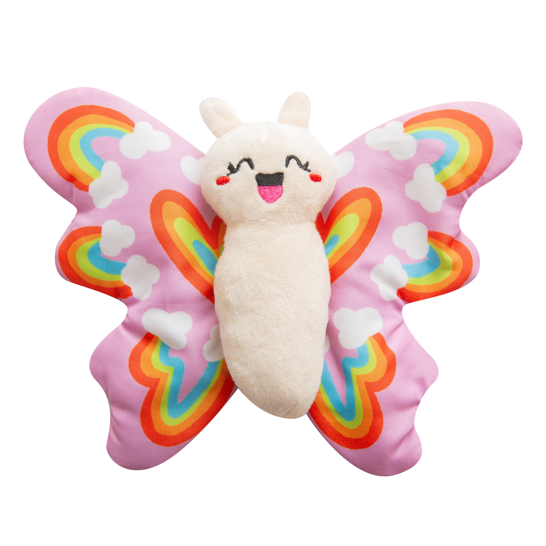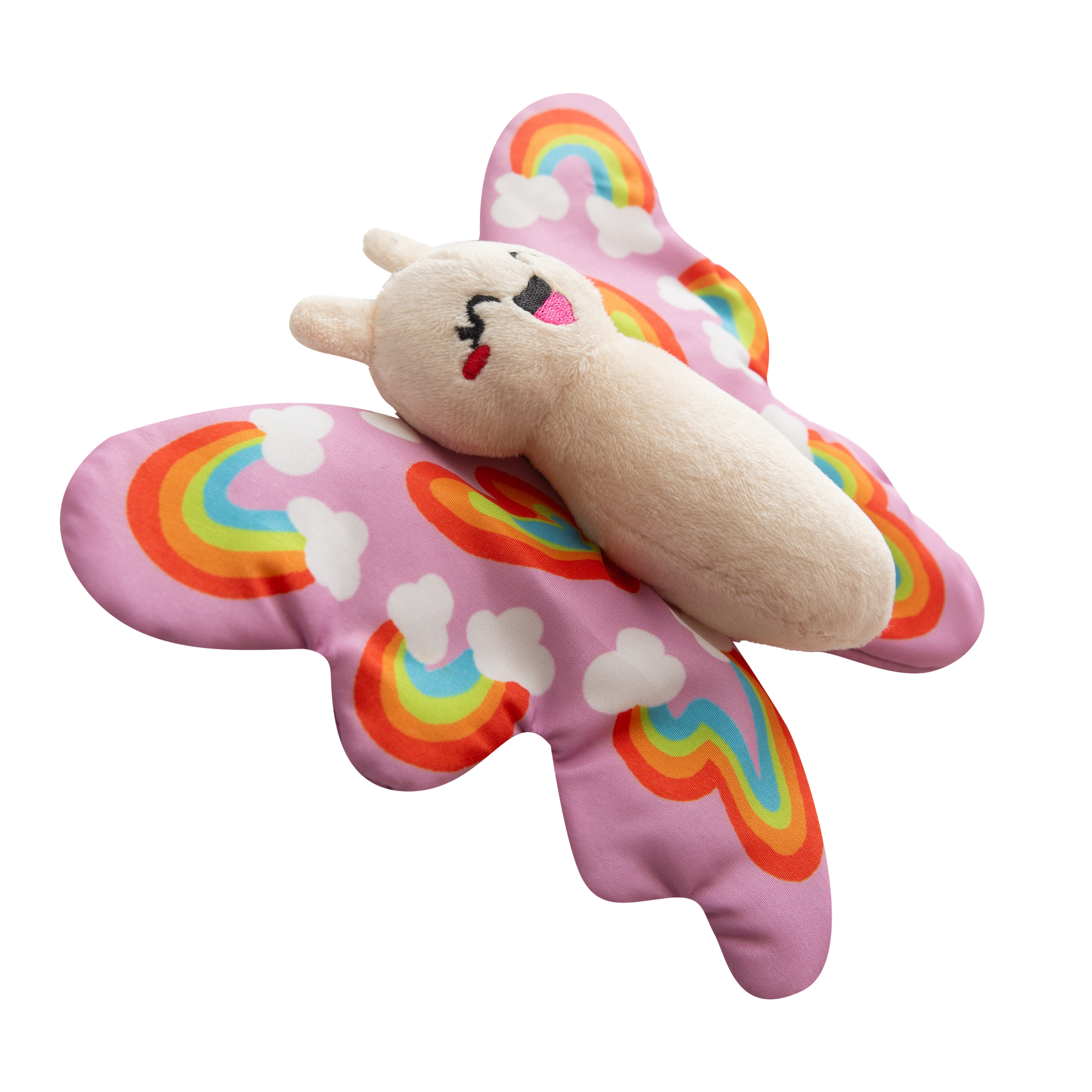 This plush dog toy features a butterfly-inspired design with bright rainbow wings and embroidered facial details for a playful look. The soft plush body provides a comfortable texture for cuddling, while the crinkle material inside the wings adds an engaging sound during play. Lightweight and easy to carry, it’s ideal for interactive games or independent play.