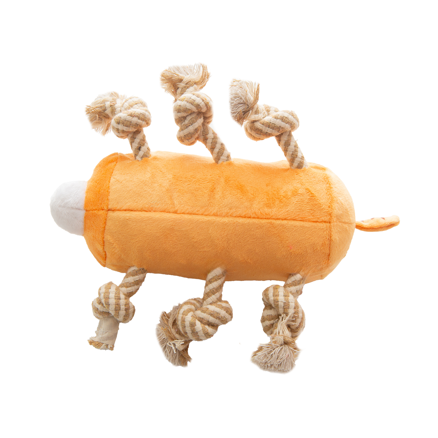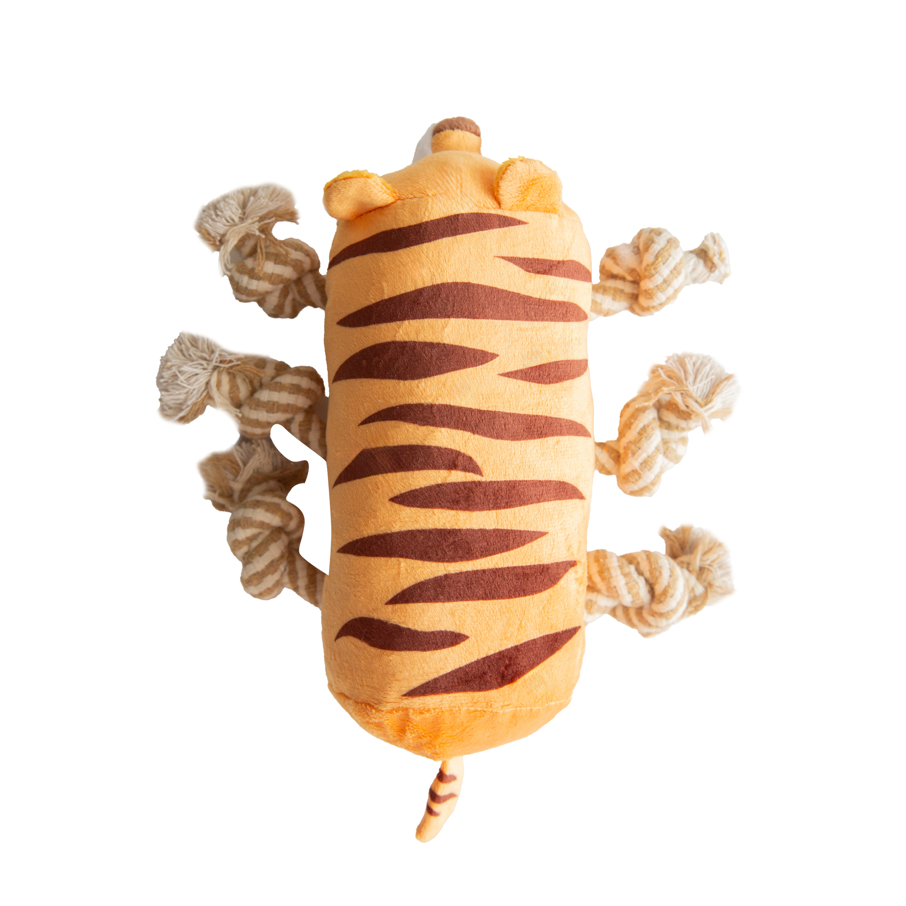 This plush dog toy features a tiger-inspired design with soft striped fabric and embroidered facial details for a playful yet durable finish. The plush body is paired with sturdy rope arms and legs, making it ideal for interactive tugging, tossing, and light chewing. The combination of soft textures and rope elements provides added engagement during playtime.
